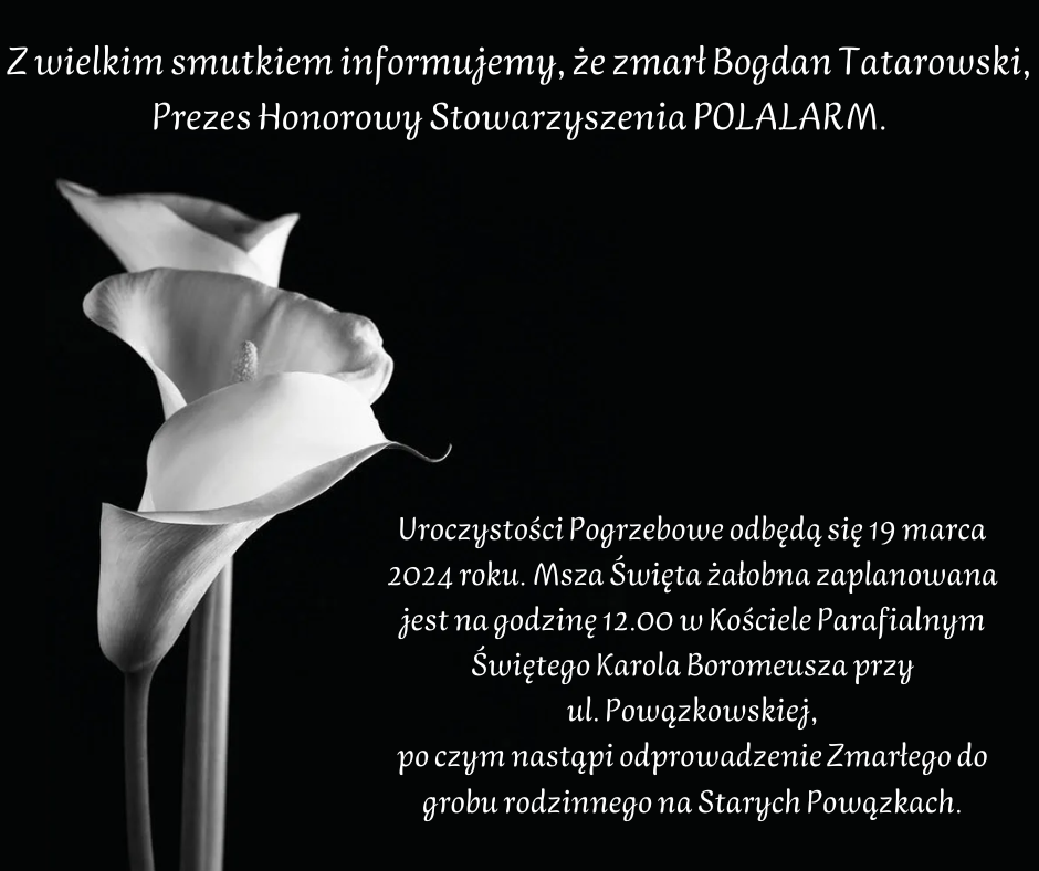 12 marca 2024 roku zmarł w wieku 85 lat Bogdan Tatarowski. Współtwórca i wieloletni Prezes Ogólnopolskiego Stowarzyszenia Inżynierów i Techników Zabezpieczeń Technicznych i Zarządzania Bezpieczeństwem POLALARM, współtwórca innych organizacji branżowych, założyciel Zakładu Rozwoju Technicznej Ochrony Mienia TECHOM, w ramach którego powstało pierwsze Laboratorium Badawcze urządzeń do systemów zabezpieczeń technicznych w Europie środkowo-wschodniej.